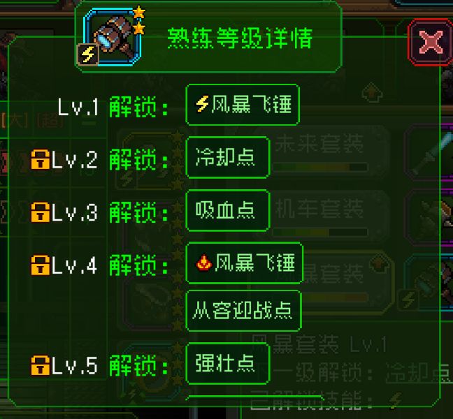 熟练度累积到一定程度时,能升级套装,解锁新的武器分支,更容易去体验到该武器的所有属性。