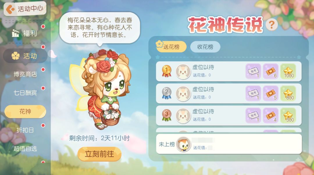 第二十七期“花神传说”活动限时开启,沉睡在百花园中的花神再度醒来,等待着有心人的到来。前来收集材料,制作花神最爱的花束,将其赠与心仪之人吧。活动期间,送花、收花达到排名条件奖励,即可获得对应的排名奖励物品哦!