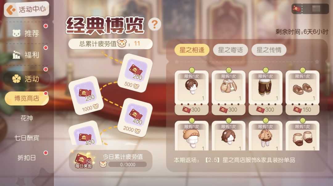 奥比们期待的兑换商店返场来啦!活动期间,小奥比们可通过劳作、采伐、挖矿、钓鱼等行为累积疲劳值获得「博览门票」,使用「博览门票」即可在「博览商店」中兑换往期主题商店的服饰、家具等物品。本期开启「星之商店」服饰和家具的兑换,喜欢的小奥比们可不要错过哦!