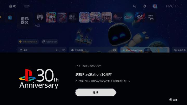 2024年12月3日,是索尼的PlayStation的30周年纪念日,玩家在启动ps5的时候,能看到来自30年前的PS开机动画。