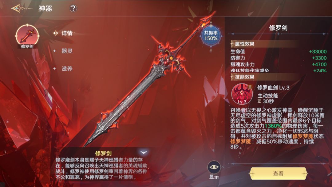 通过提升神器滋养阶级可提升神器属性、获得华丽神器特效、并可手持神器畅游斗罗大陆。