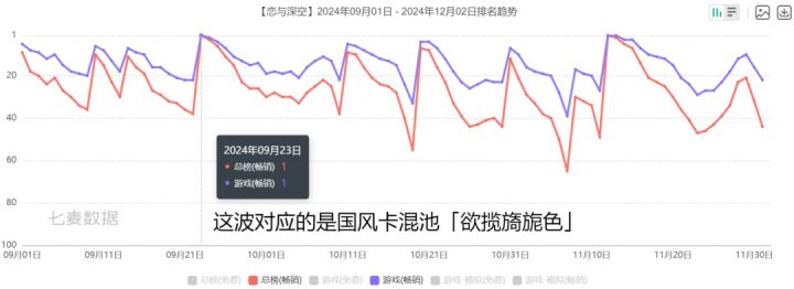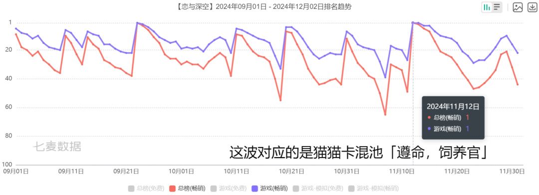 一次两次或许是偶然,但接二连三的冲榜佳绩,足见其强大实力。与前两次不同,此次冲榜靠的是男主之一秦彻的单人新池,含金量极高。我们之前多关注其在游戏畅销榜的表现,然而它三次登顶 iOS 总榜榜首,这表明它在整个 iOS 市场都拥有不容小觑的竞争力,能取得如此成就的游戏实属罕见。