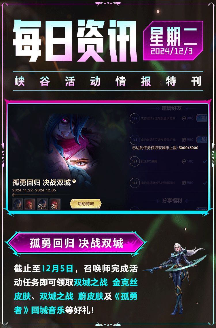 奖励:双城之战 金克丝皮肤,双城之战 蔚皮肤,专属回城音乐《孤勇者》,头像-海克斯水晶等奖励