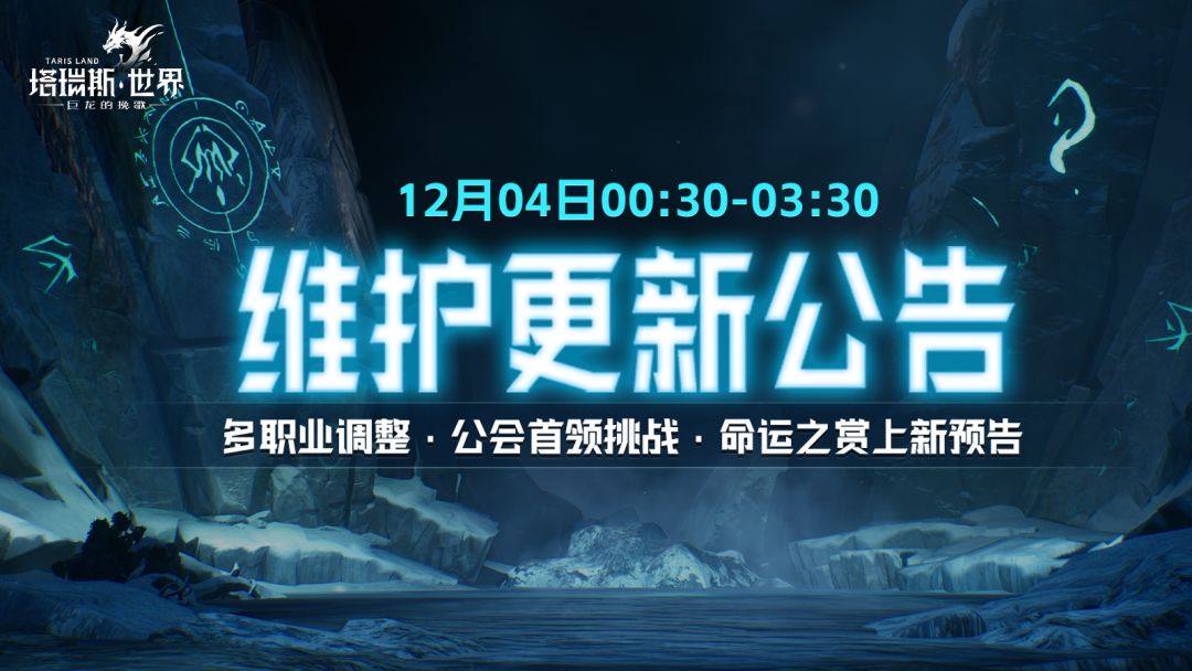 本周更新公告已送达!游戏将于12月4日(周三)凌晨进行维护更新。新玩法「公会首领战」将于12月5日开放,全新命运之赏奖池将于12月12日开启。另有游侠/蛮斗士/战士职业调整,下滑查看详情↓