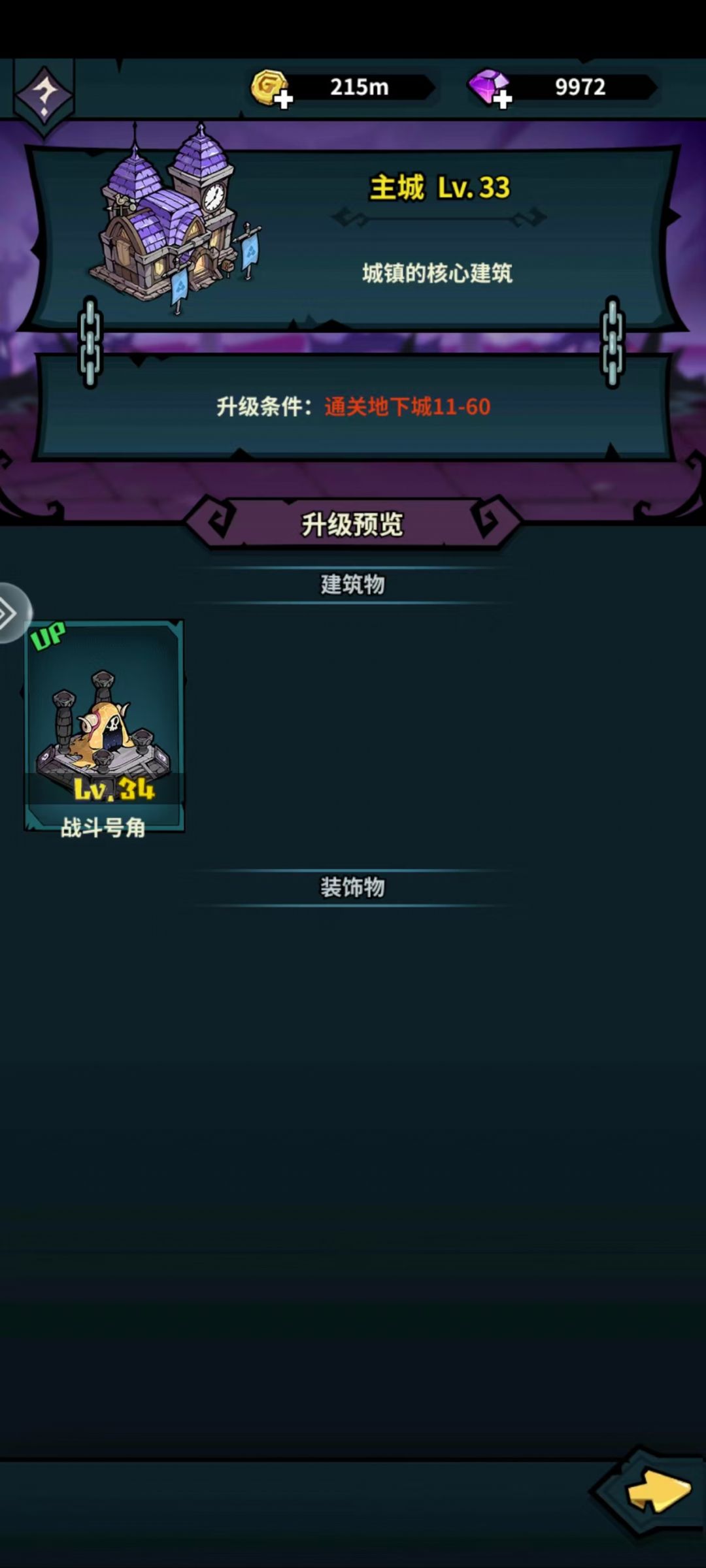 影响其他建筑等级上限,可以解锁更多装饰品,是小镇的核心建筑。通过到达地下城要求关卡后使用金币升级。(主城等级会限制宠物等级上限,影响金币补充的金币数额!)