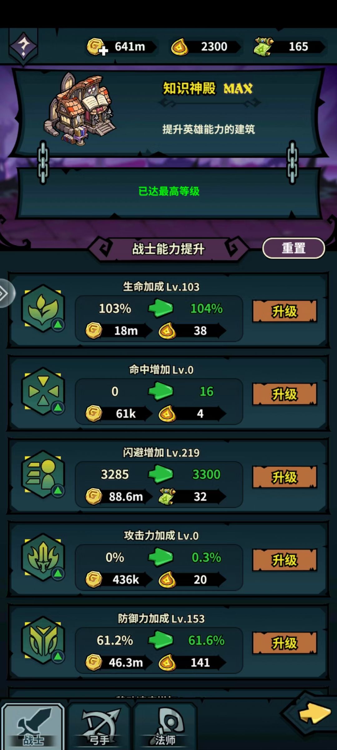 1、知识神殿注解:因每种职业所擅长的属性不同,知识神殿内将分别对战士、弓手、法师进行加成,每次升级都对该职业的所有英雄生效。(知识神殿等级影响能力提升等级上限,推图10-60后知识神殿可升满级,100钻石可无损重置单页加成)
