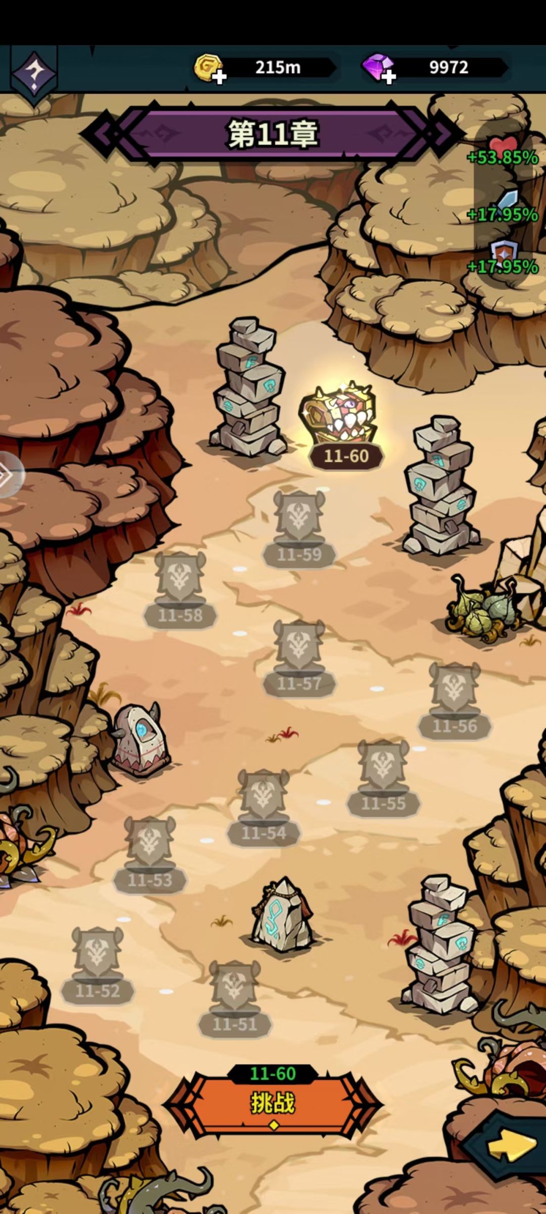 点击主页面地下城或主地图地下城(那个骨头龙脑壳)可以进入推图界面,地下城进度影响建筑等级上限和挂机奖励等级提升。