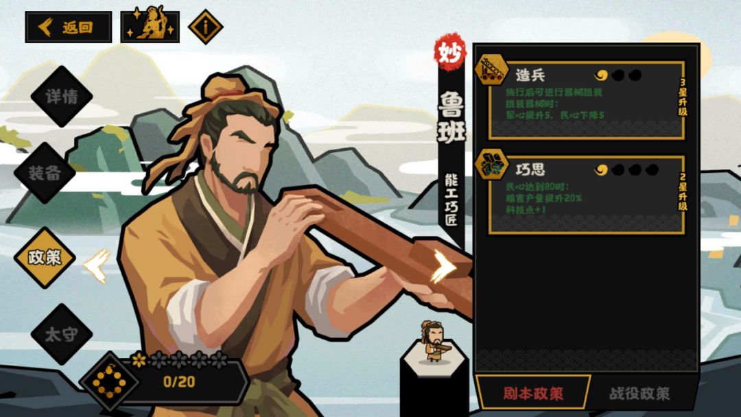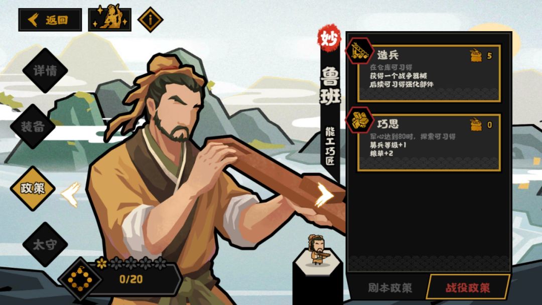 鲁班最有意思的政策,施行后进入造兵界面,造兵一共可以改装三种器械,同一种强化词条对于不同的器械有着不同的效果,下文会展开讲解~