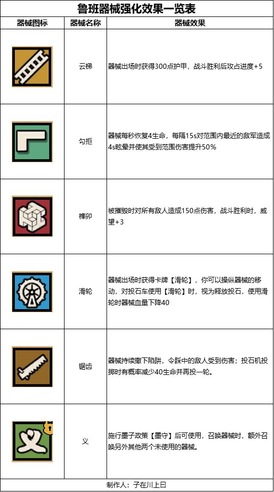 然后回到强化的解析,鲁班的器械拼装一共有六大类,实战中最多选取三种,因此需要根据自身需求以及名臣搭配合理选择,玩家也可参照下表~