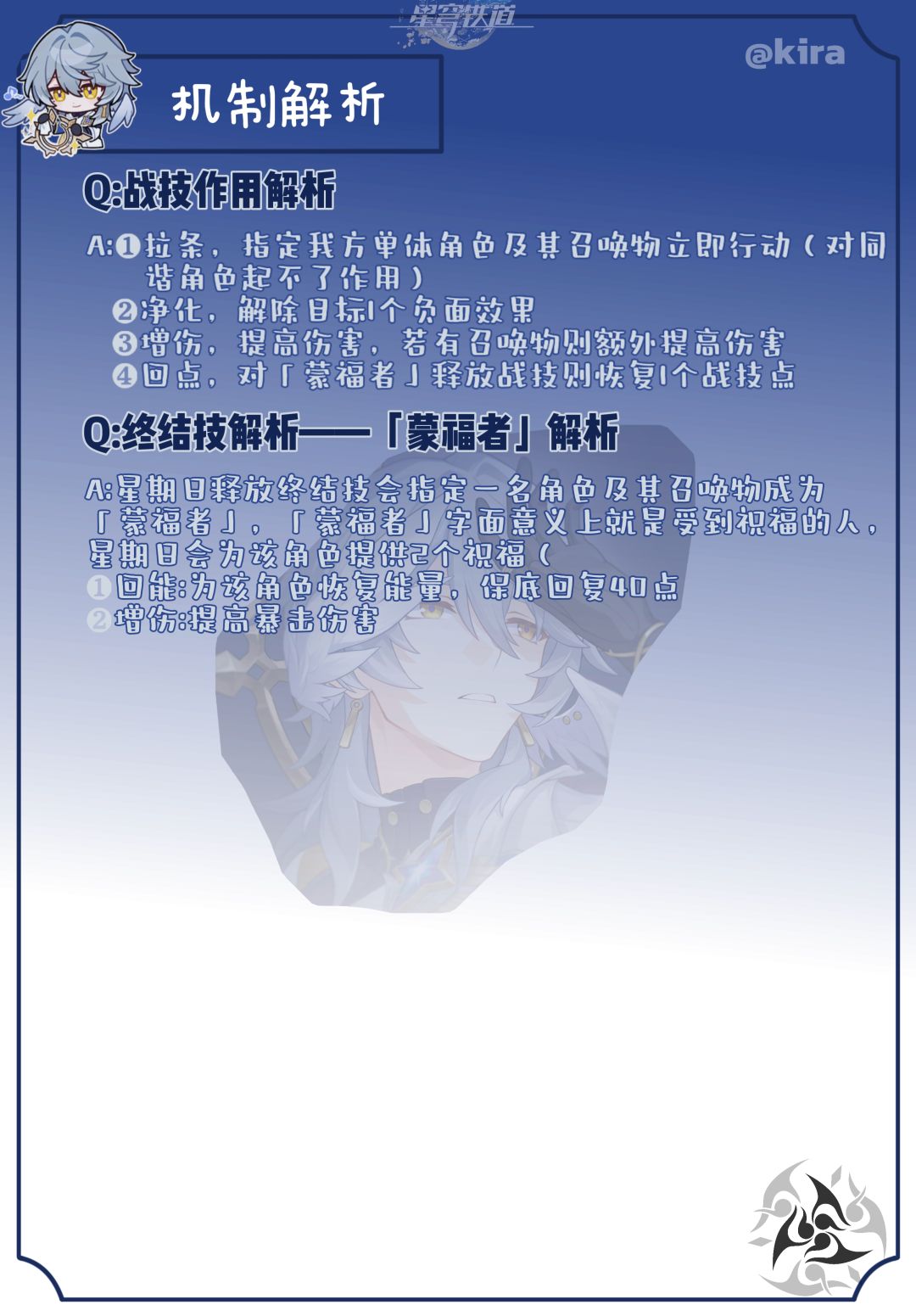 A:星期日释放终结技会指定一名角色及其召唤物成为「蒙福者」,「蒙福者」字面意义上就是受到祝福的人,星期日会为该角色提供2个祝福(