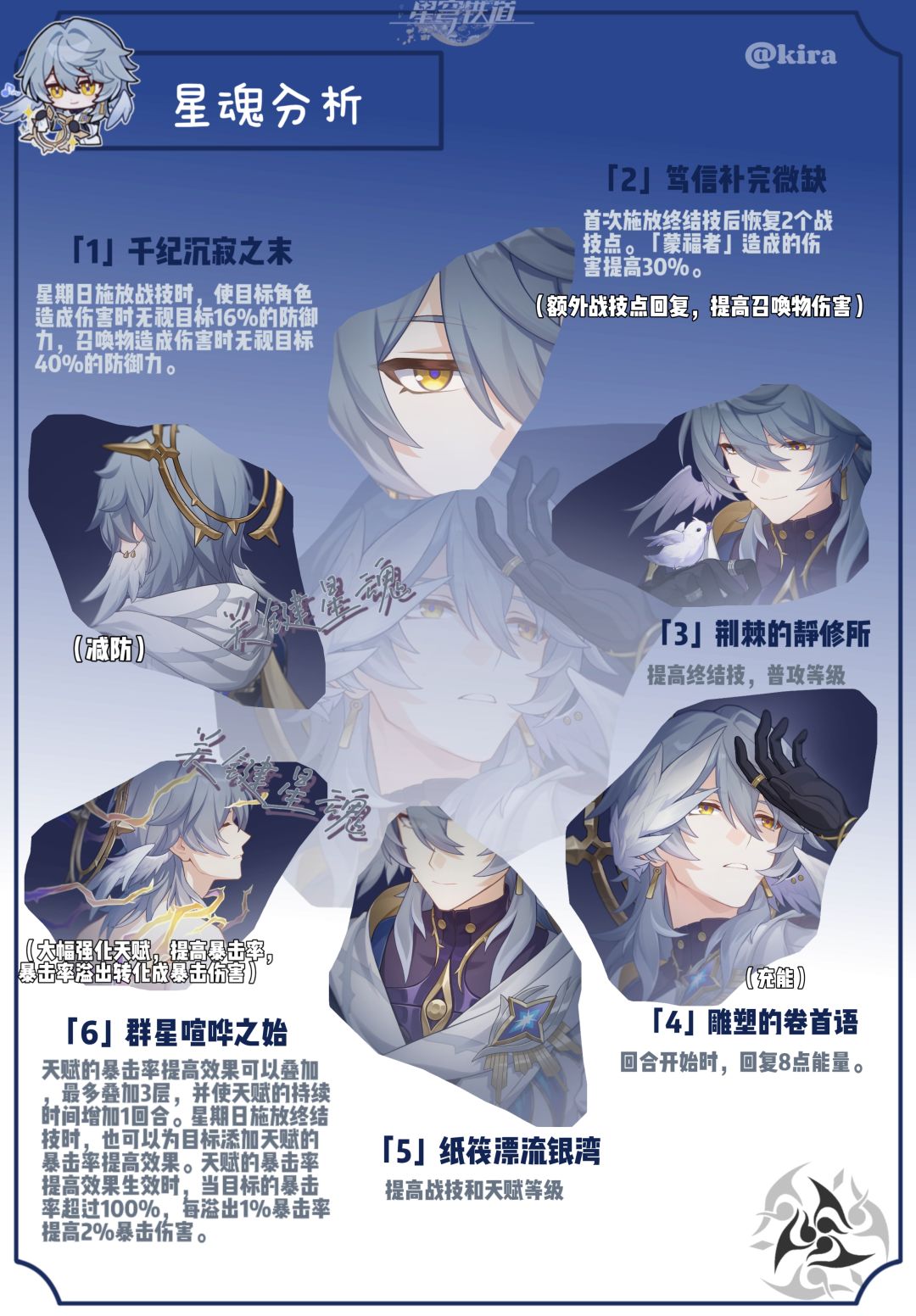 天赋的暴击率提高效果可以叠加,最多叠加3层,并使天赋的持续时间增加1回合。星期日施放终结技时,也可以为目标添加天赋的暴击率提高效果。天赋的暴击率提高效果生效时,当目标的暴击率超过100%,每溢出1%暴击率提高2%暴击伤害。