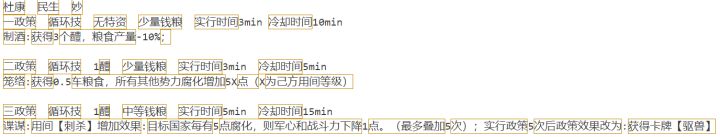 三政策则对应少康刺杀寒浞下属、驱兽击败寒浞军队。寒浞的政策效果是军心、腐化、战力三高,其中腐化是主要发动机。该政策则针对腐化进行军心和战力的打击,同时体现了二政策准备充足、三政策韬光养晦后的一击致命。