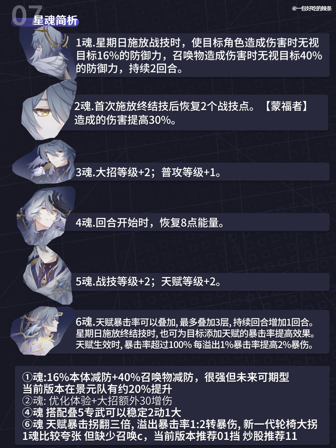辣条对星期日的简评:召唤体系的核心辅助,当前版本在亏模 不考虑召唤物的情况下,仍有超越其他单体拐的辅助能力,而且更是能把开服老c景元抬到2.0主c的水平