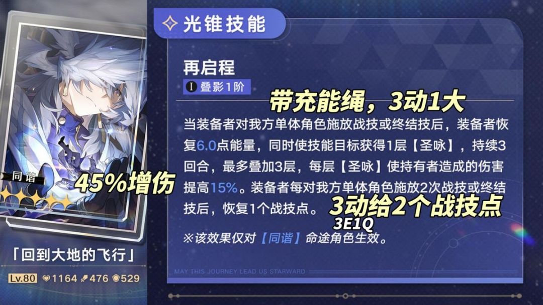 此刻有3种解决方案:①3、4号位队友正向产点,相应的配队就非常局限了;②将操作改为‘主C普攻产点+星期日战技拉条+主C战技’,降伤害来维持点数循环。需视主C机制玩法决定,托帕、灵砂可以,景元则会亏部分神君层数;③加1金抽取光锥「回到大地的飞行」,能量恢复可确保星期日3动1大,叠满45%增伤也很泛用,以及关键的2次战技/终结技后恢复1战技点。