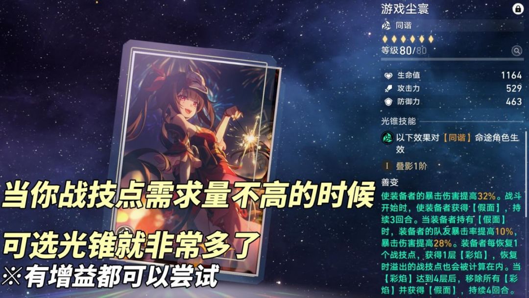 遗器词条总量有限,星期日高速路线自然暴击伤害会低一些,变相使得终结技方面提供的暴伤转化量会低一些。适合本身就面板高暴伤的主C,这方面乘区稀释高。此刻若搭配一些产点队友,进一步降低对战技点需求时,星期日光锥可选配置就多了起来,各种增益类型都能往上套。例如:舞舞舞、芳华待灼、镂月裁云之意等等。
