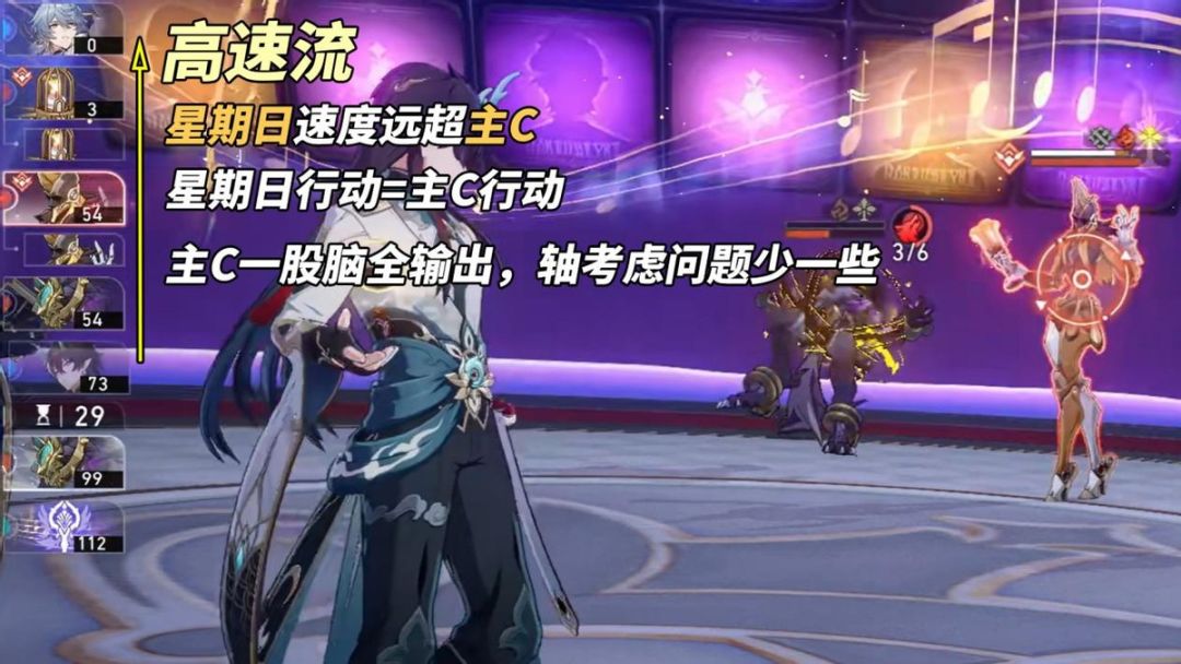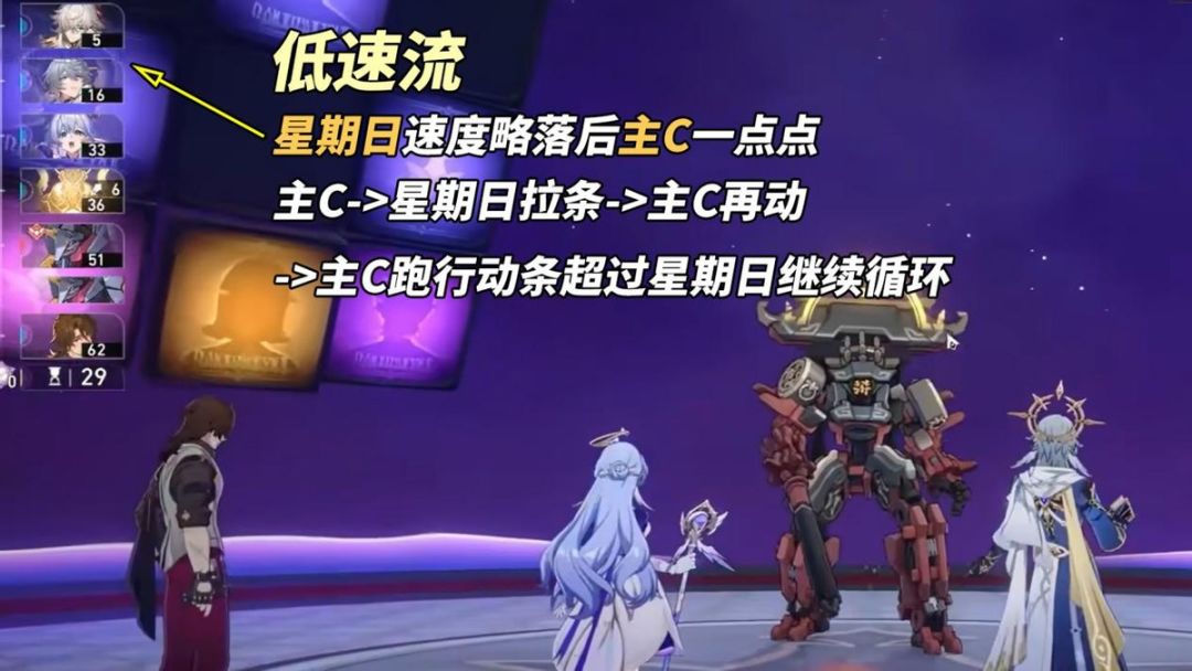 这三种选择,取决于你预想的星期日配队构建。若是都不愿接受,也可考虑另一种星期日玩法。【高速星期日】主C全身心堆输出数值,星期日则走超高速路线。以星期日立即行动的拉条,意味着主C行动频次将完全跟随星期日速度,以‘星期日拉条+主C行动’作为1个小循环。