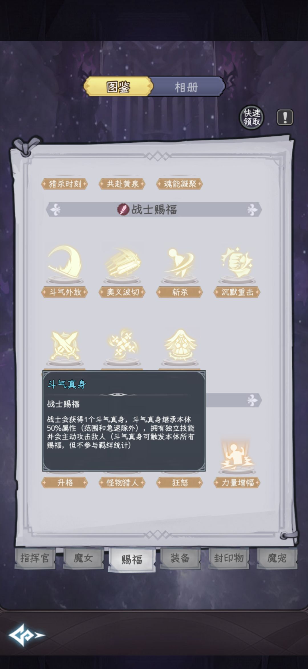 战士会获得1个斗气真身,斗气真身继承本体50%属性(范围和急速除外),拥有独立技能并会主动攻击敌人(斗气真身可触发本体所有赐福,但不参与羁绊统计)