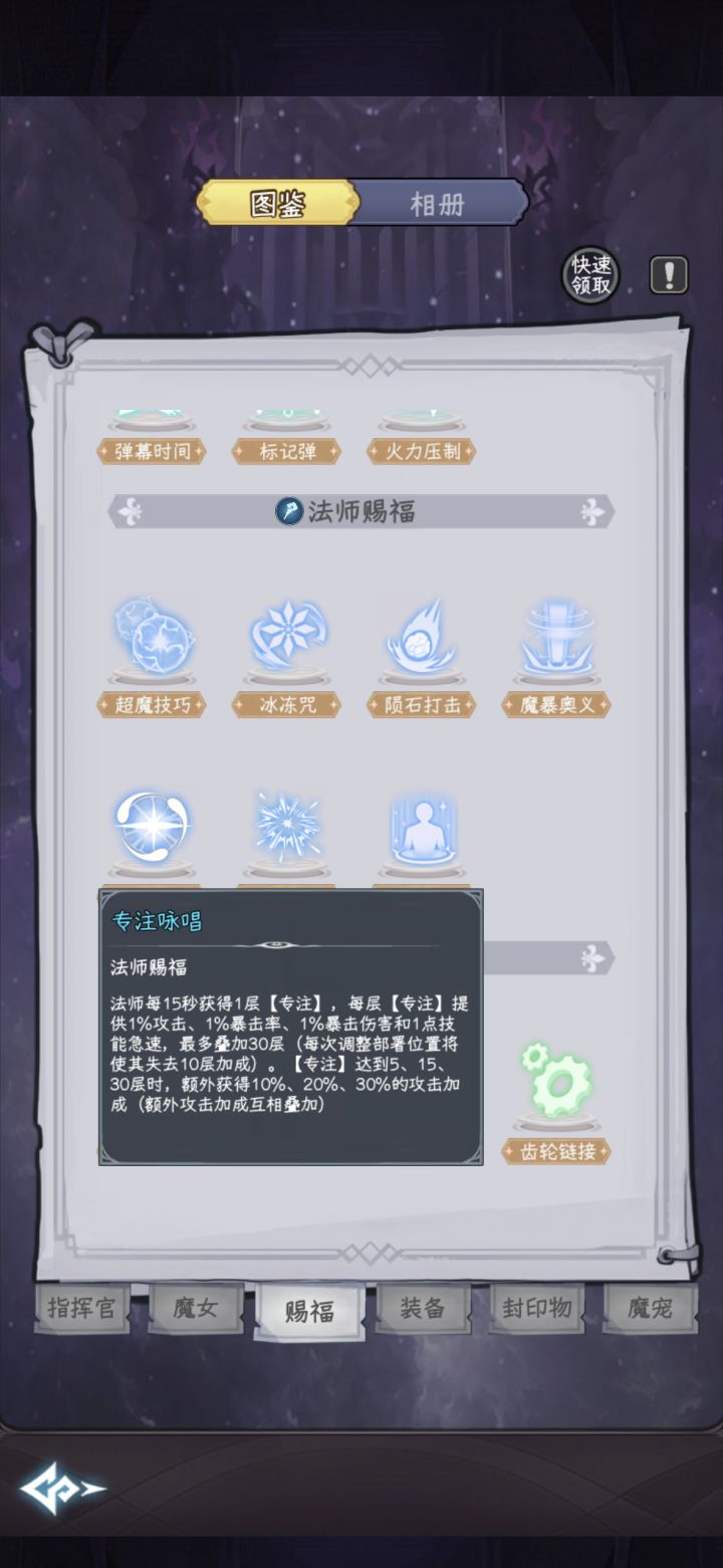 法师每15秒获得1层【专注】,每层【专注】提供1%攻击、1%暴击率、1%暴击伤害和1点技能急速,最多叠加30层(每次调整部署位置将使其失去10层加成)。【专注】达到5、15、30层时,额外获得10%、20%、30%的攻击加成(额外攻击加成互相叠加)