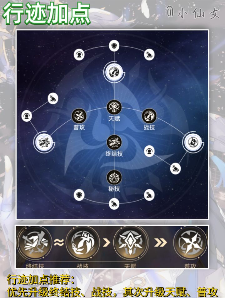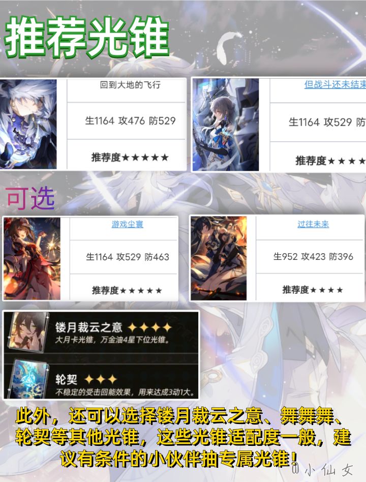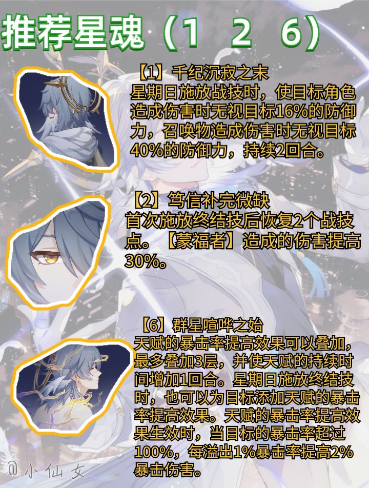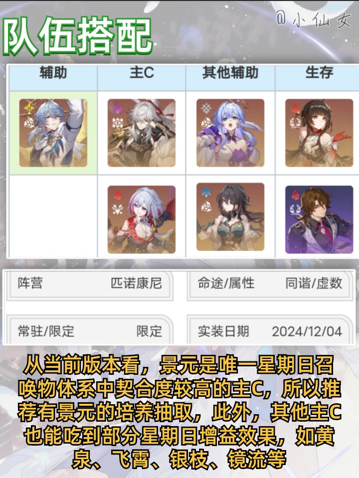 【角色定位】星期日是一名能使我方角色及其召唤物立即行动的辅助型角色。此外,星期日还能使我方指定角色百分比恢复能量,并使该角色及其召唤物造成的伤害、暴击率、暴击伤害提高。星期日是一名虚数属性-同谐命途角色,集拉条、增伤、回能、产点于一身,具备强劲的单拐数值及全面的辅助功能,能够同时拉条主c及其召唤物提供二倍行动增益,大幅优化召唤c的出伤节奏,使召唤C造成短时高频的双份输出,终结技可对单体提供回能,加速主c的行动循环,结合技能关联可提供产点,是当前新时代的通解辅助,对于召唤c则有着进一步的特化数值增益,是未来召唤c的专属引路人,其辅助价值自然也会随着召唤体系的不断完善而提升。#在第八日启程 #崩坏星穹铁道 #崩坏星穹铁道攻略 #崩坏星穹铁道星期日