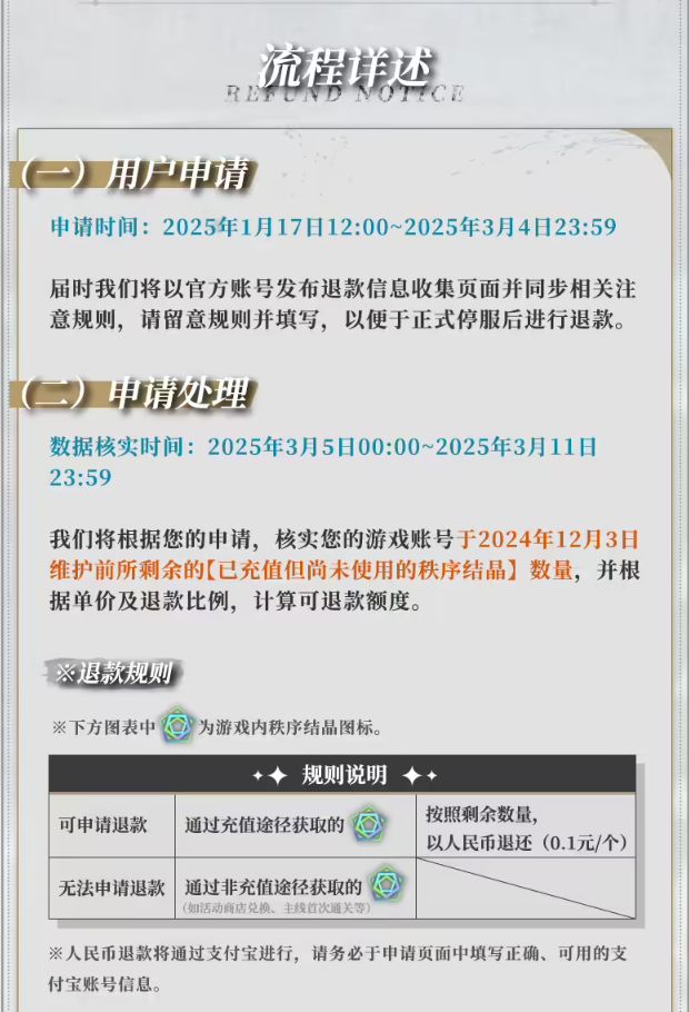 《千年之旅》将在 2024 年 12 月 3 日维护期间留档玩家游戏账号中的【已充值但尚未使用的秩序结晶】数据,以便于正式停服后进行退款。如果玩家的游戏账号内截至 2024 年 12 月 3 日仍有尚未使用的付费秩序结晶,届时可以按照以下流程发起退款。