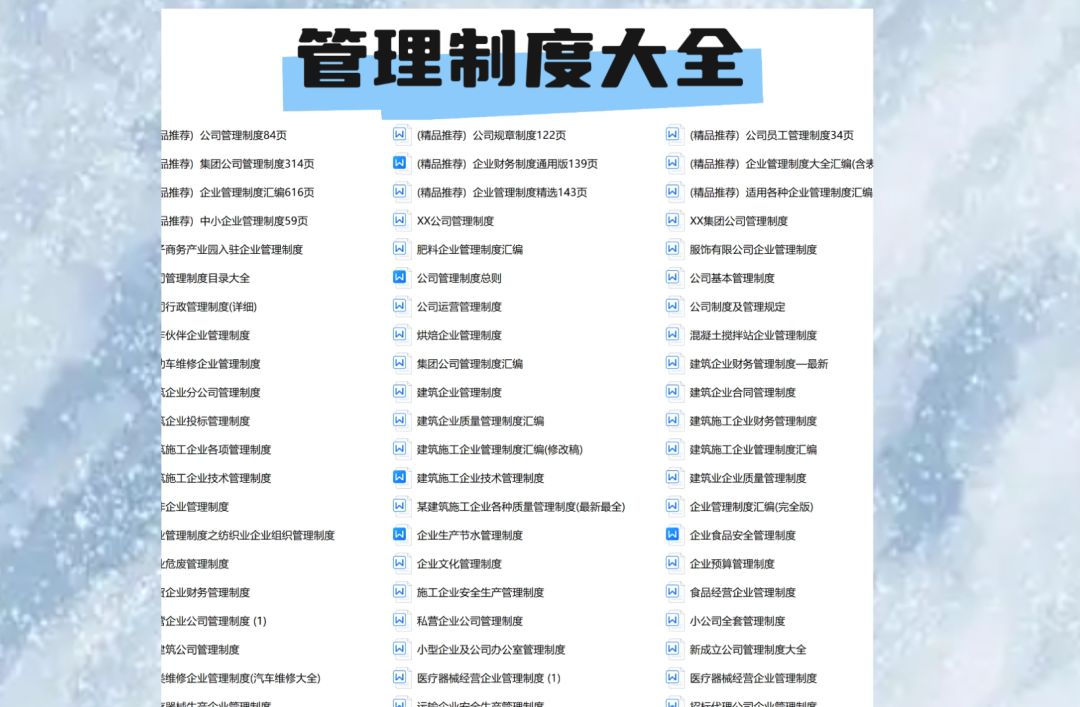 专业人士精心整理,电子版资料,企业制度这一套就够了,薪资管理资料包,企业管理制度工具包,采购供应链管理体系,工程与项目管理体系,管理制度大全,财务管理体系,安全管理体系,生产管理体系,销售管理体系,初创公司全套协议,质量管理体系.