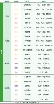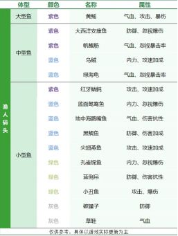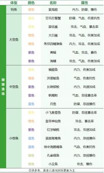 鱼灵根据体型,可分为大型、中型、小型、特殊四类,可装备在对应的鱼灵槽位。鱼灵根据稀有度,可分为灰色、绿色、蓝色、紫色、橙色、黄色六种,品质越好的鱼带来的增益也越好。此外,还可以捕到掉落在渔场的各种物品,比如,破罐子、草鞋等。
