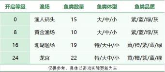 渔场品级越高,开放的鱼类数量也越多。需要注意的是,渔夫等级达到一定等级才能开放指定渔场。