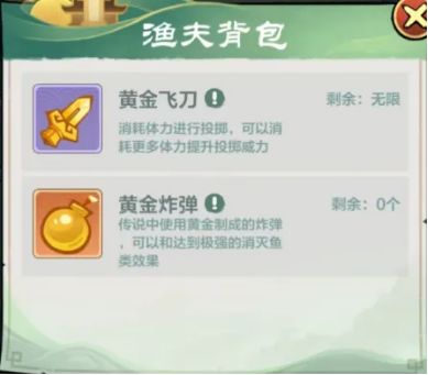 渔夫背包存放着黄金飞刀和黄金炸弹。其中,黄金飞刀就是我们平常捕鱼用的兵器。当渔夫等级达到10级时,可在商店解锁黄金炸弹,增添捕获稀有鱼类的又一重磅武器!