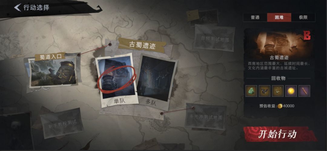 12月5日的版本更新后,工友们在“行动选择”界面,点击“古蜀遗迹-单队”,即可选择适合自己的难度等级啦~