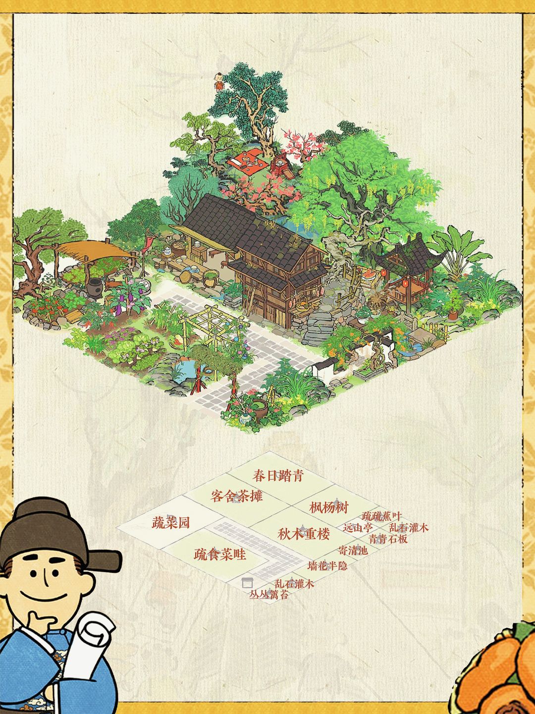 建筑:秋木重楼,客舍茶摊,春日踏青,枫杨树,蔬菜园,疏食菜畦,墙花半隐,疏疏蕉叶,青青石板,丛丛篱苔,乱石灌木,远山亭