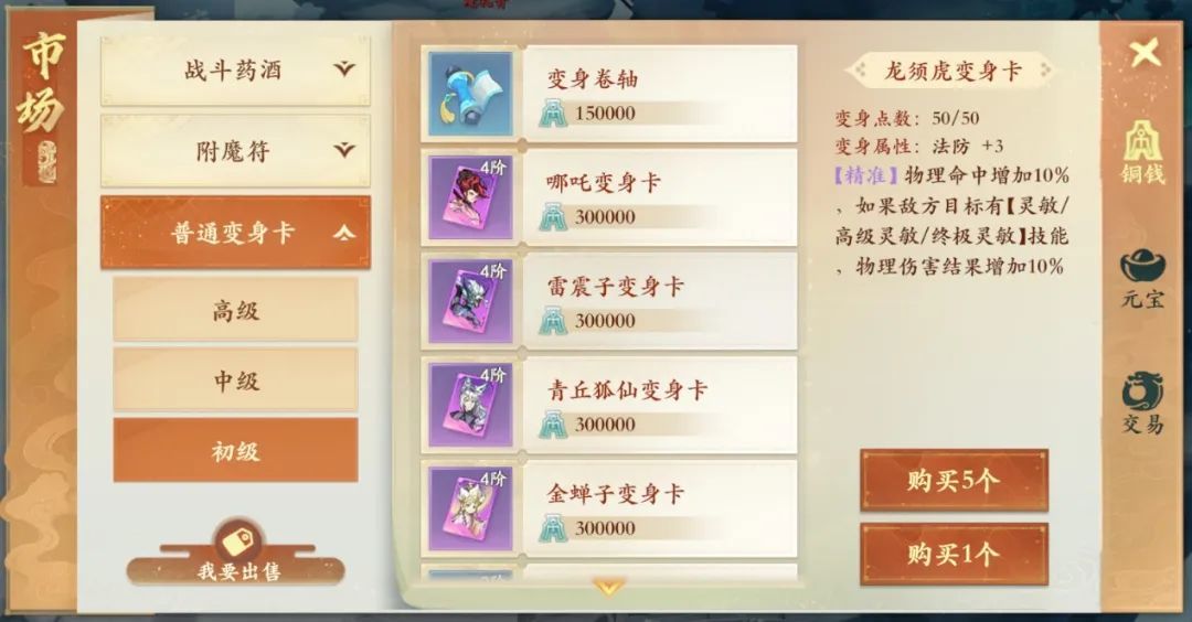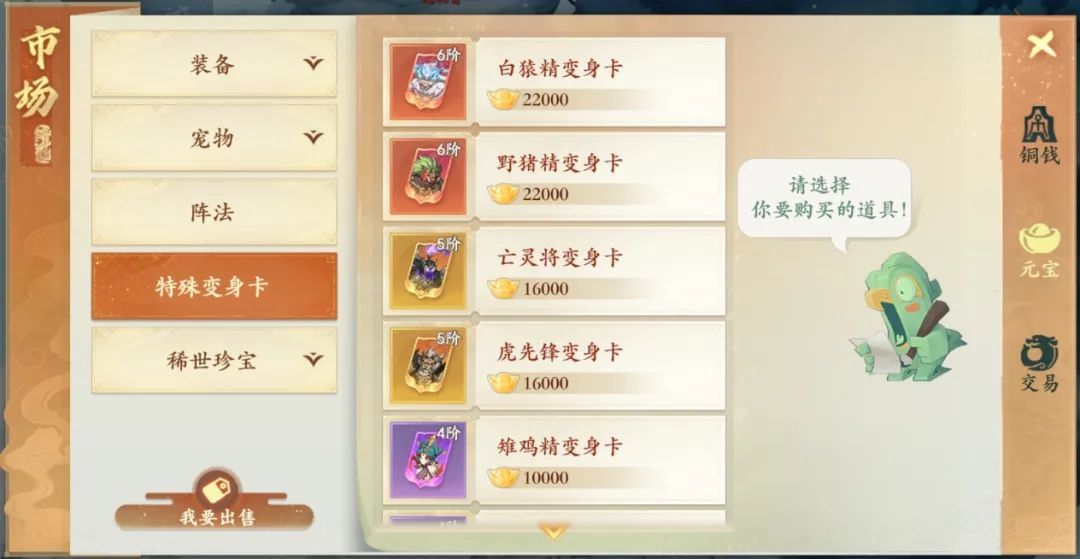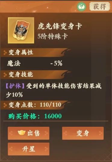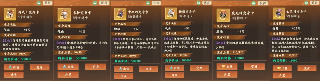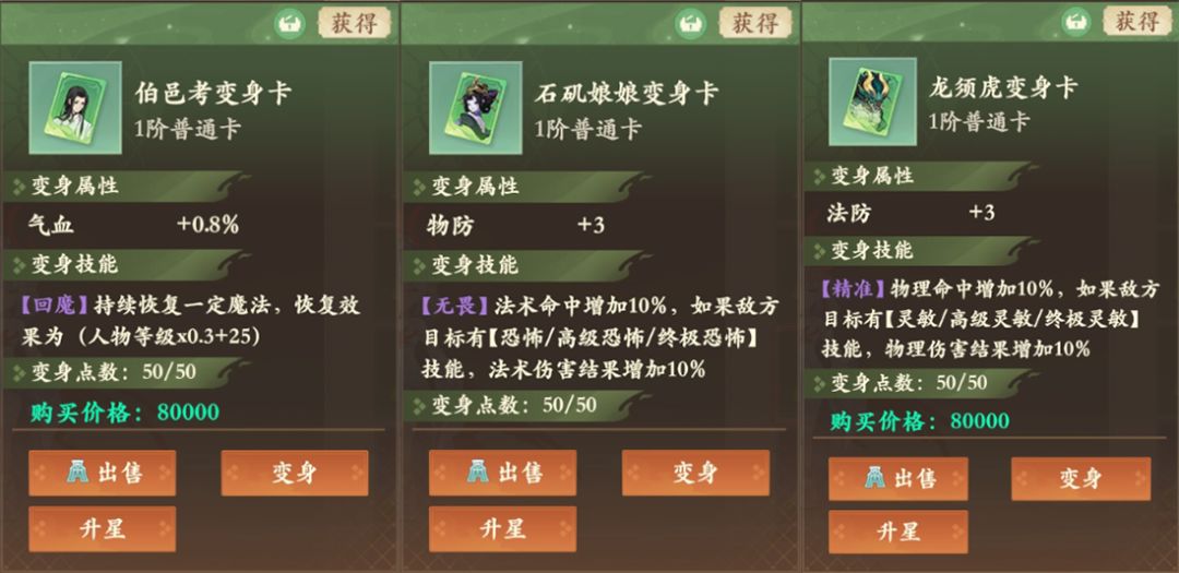 获取:1-4阶的普通卡,可以直接在铜币商城购买;每日的竞技场赠送变身卡;元宝市场有特殊变身卡可以购买