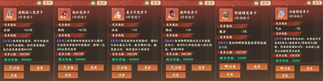 作用:每张变身卡使用变身后,不仅可以给我们带来一定的基础属性变化,同时会附带一些强力技能,升星变身卡还能解锁更多固定属性加成。注意:不是所有的基础属性都是正收益的,有些变身卡的属性是减属性的