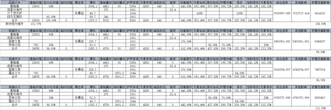 本次计算中,有个比较有趣的情况,如果是早3突袭+3贵族的比较通用的搭配的情况下,仙旅火木比之英魂水火强非常多,大概差距10%,也就一代武器的水平,但是如果是在使用3突袭+2狩猎+龙牙的情况下,那么英魂水火的伤害会略高于仙旅火木2%的伤害,并且还有聚怪的机制,