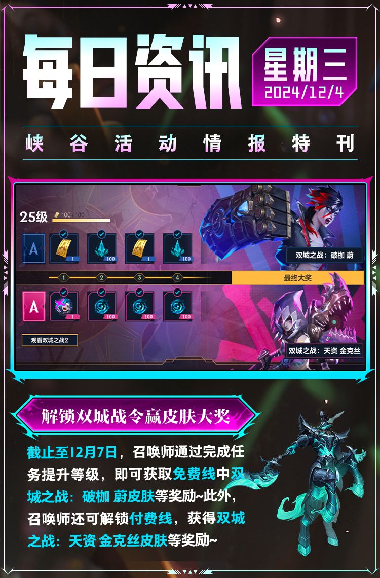 奖励:双城之战 金克丝皮肤,双城之战 蔚皮肤,专属回程音乐《孤勇者》,头像-海克斯水晶等奖励
