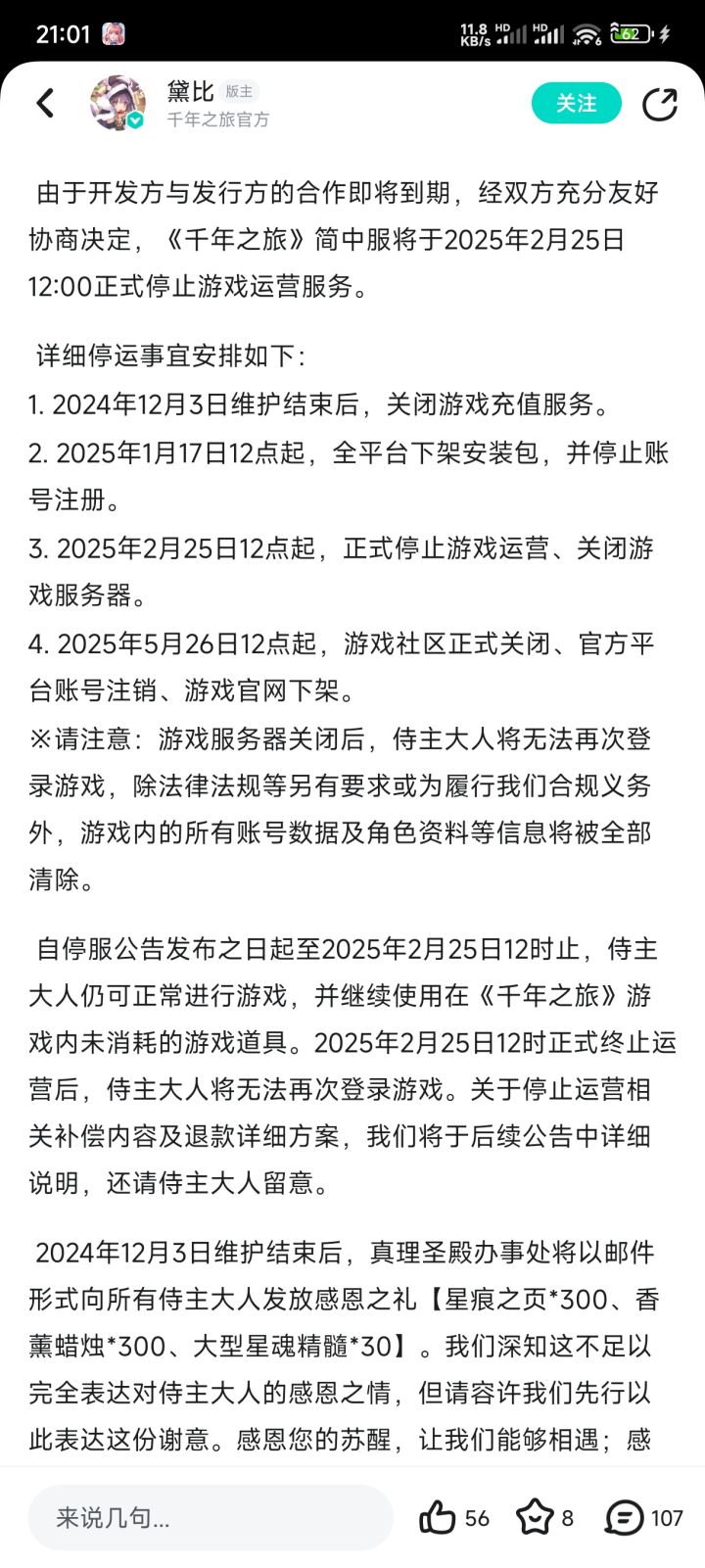 由于开发方与发行方的合作即将到期,经双方充分友好协商决定,《千年之旅》简中服将于2025年2月25日12:00正式停止游戏运营服务。
