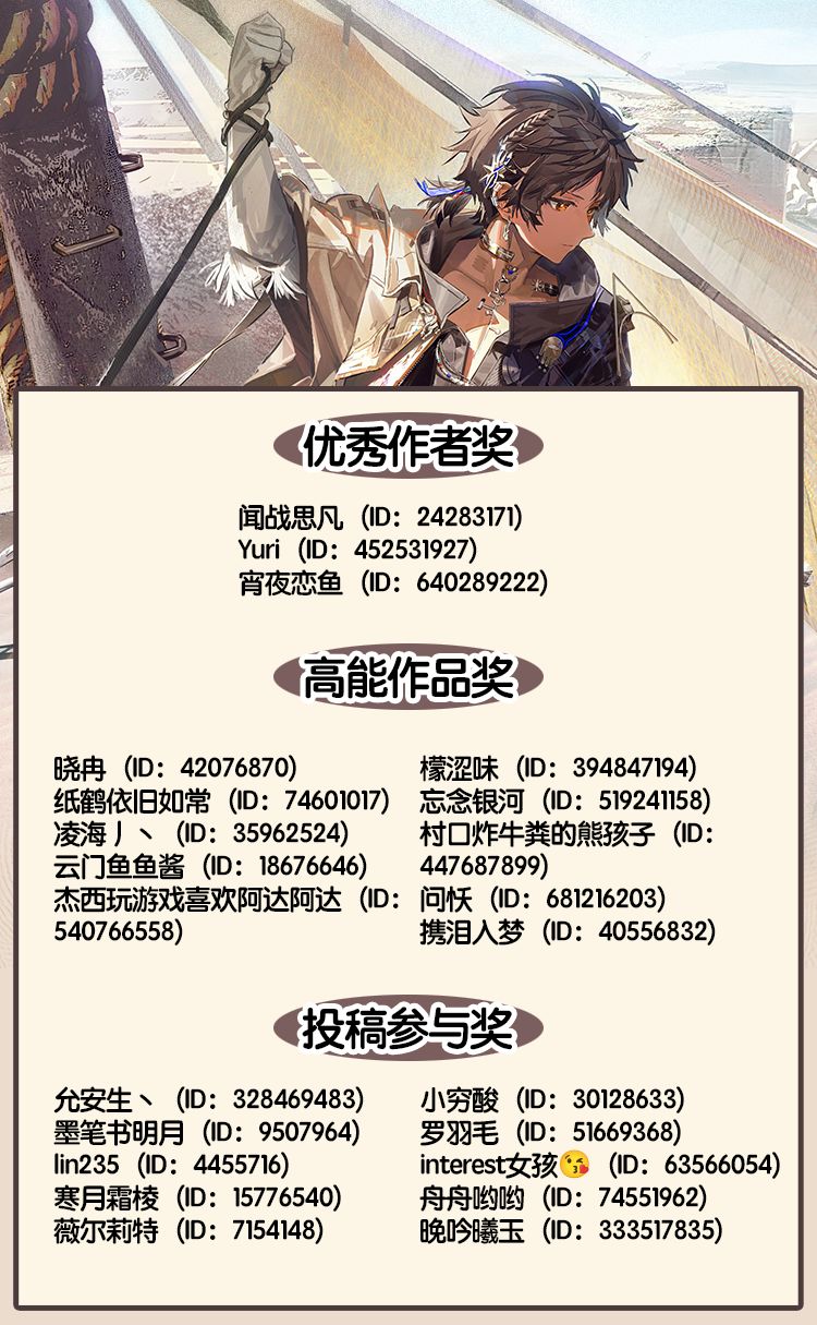 活动期间,投稿有效投稿作品≥2,综合考虑质量和数据维度,选出TOP1-3的优秀作者分别获得【123罗德岛礼物系列盒蛋-整盒】一份