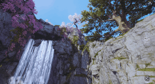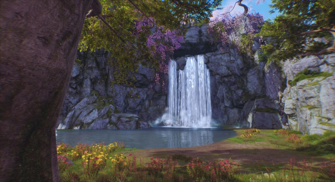 瀑布从高处倾泻而下,水花四溅,与静谧森林形成对比。湖水如镜,映照蓝天白云,岸边山花烂漫,色彩斑斓,为森林添彩。仿佛置身真实世界,是拍照休憩的好去处。灵芝们,不妨来此游山玩水,享受片刻宁静。