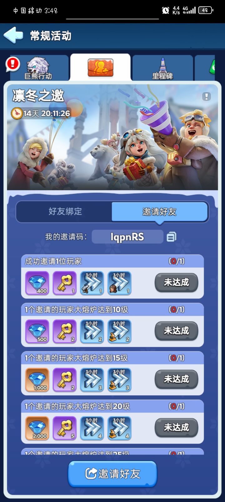 常规活动:凛冬之邀【好友邀请码】: lqpnRS