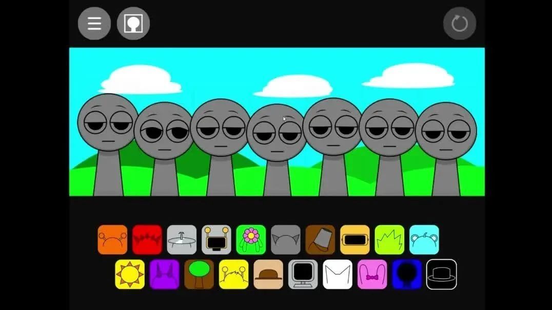 “Sprunki”有两个模式。第一个模式的游戏画面看起来非常小清新,玩家将不同节奏放到音轨上之后,原本灰色的小人就会变成颜色鲜艳、形态各异的卡通角色,这些角色带来的节奏或旋律也比较活泼,玩家可以借此制作出轻松跳跃的电子音乐。