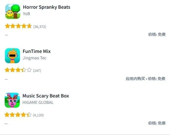 为了能在这波热度下分得一杯羹,很多游戏厂商也加入了这一赛道,快速推出了大量类似的游戏,我们在文章开头提到的《Horror Sprunky Beats》《FunTime Mix》《Music Scary Beat Box》就是这类产品。