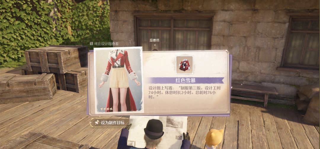 白天(5点-21点)边境哨所旁的小屋外,温德塔正在考虑为王国卫队的卫队员设计一双合适的手套,换一件装扮或许可以给他一些灵感。