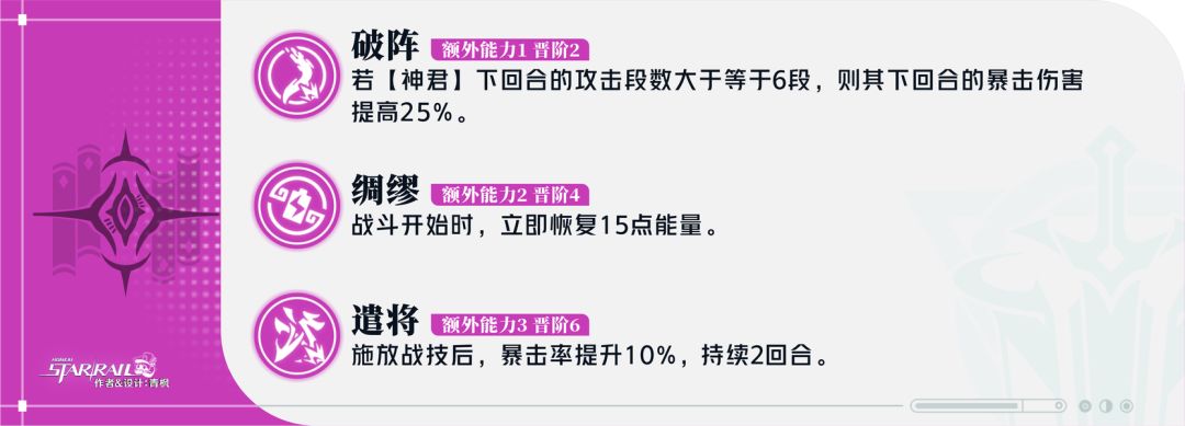 ●行迹1,【神君】段数>6时,行动后暴伤提升,增加【神君】的行动伤害,实战中尽可能保证高叠层就好;