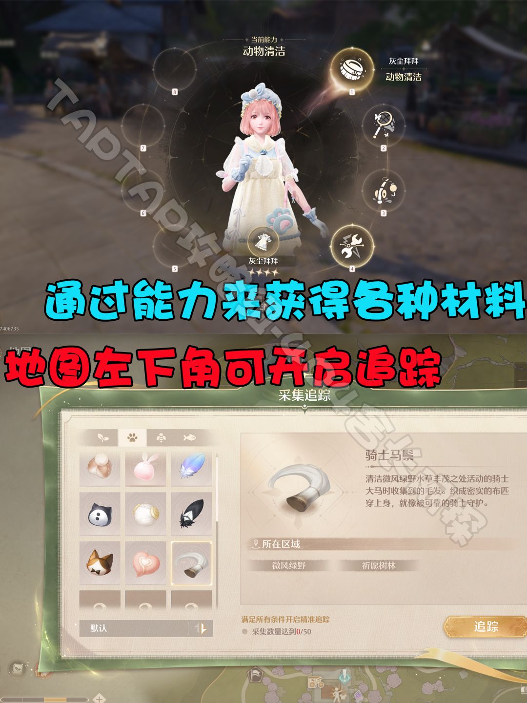 4.稀有材料:我们可以通过动物清洁、捕虫、钓鱼、战斗来获得各式各样的材料。随着你能力的提升,我们可以获得的材料稀缺度就越高。有很多高级服装的制作都是需要一些稀缺材料的。打开世界地图,右下角还可以对已经见过的材料进行追踪,采集50次之后可以解锁该材料的精确追踪。