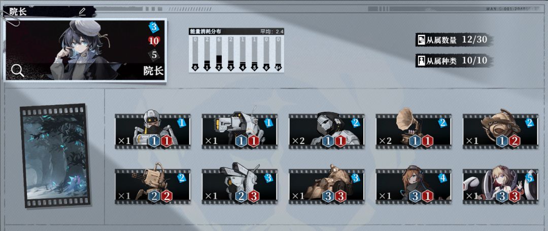新院长适用编组,结合自行系列和ED格林系列,能量消耗分布主要为1到2点,适合在战斗初期铺开场面快速形成战斗力。