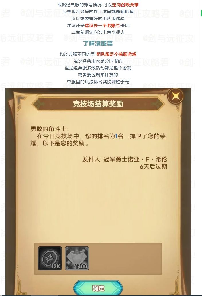 但是组队服就不一样了,除了新手冲关活动的一次性奖励外,组队服的竞技场根据每日排名,还有占比较大的JJC币和钻石奖励,所以碰到氪佬聚集的区0氪玩家是可以考虑去另个区再看看的。这里提示一下,竞技场排名有首次达到排名的一次性奖励,最好在前几天大家差距不大的时候尽量打到一次第一名(无需结算时间)。