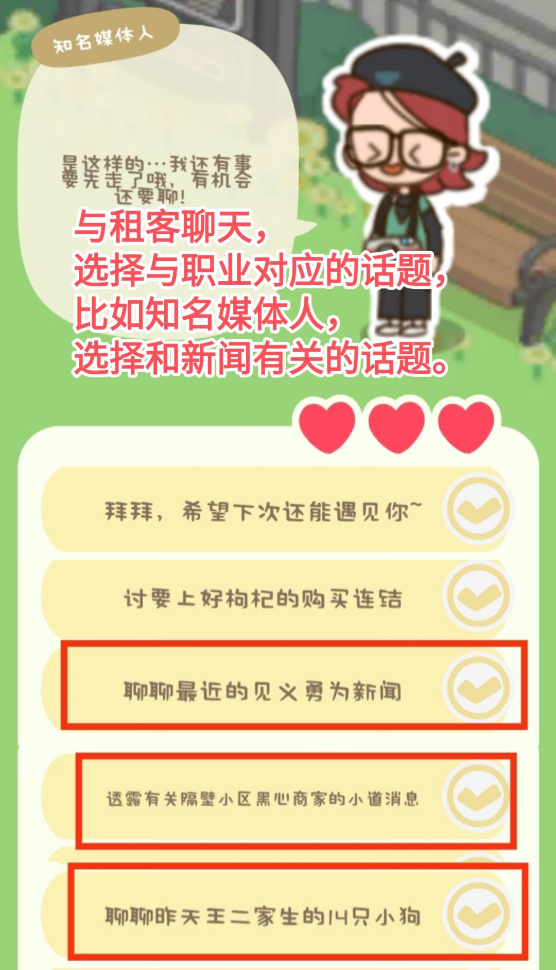 选择对应职业的话题才能让租客开心,得到奖励哦!![[表情_开心]](https://img.tapimg.com/market/images/48516f625646b5ea2c66f0cab3c9c52a.png)