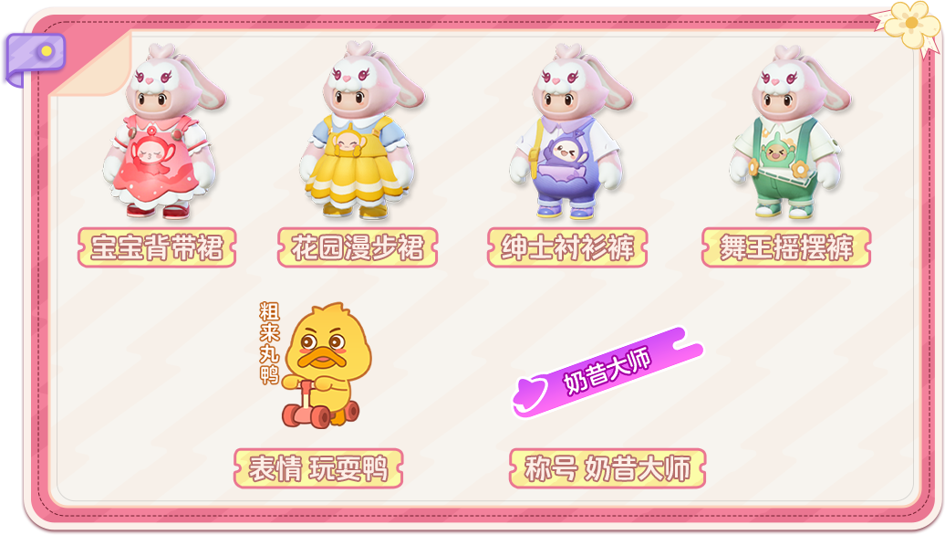 天线宝宝时间到!2024年12月6日-2025年1月5日,星宝完成任务以及被助力,可获得奶昔。向天线宝宝赠送奶昔,提升好感度,可免费领取对应联动时装:绅士衬衫裤、舞王摇摆裤、花园漫步裙、宝宝背带裙。解锁宝宝时装,还可额外获得表情 玩耍鸭、称号 奶昔大师哦!