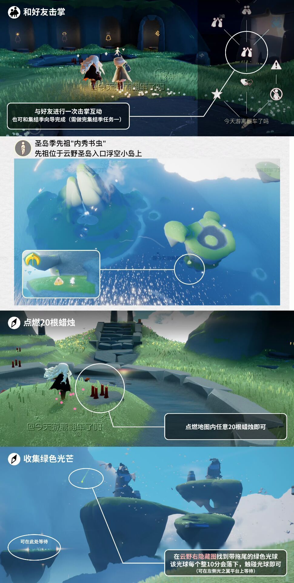 《光遇》游戏中每天的每日任务及大蜡烛的位置都不相同,玩家完成每日任务及收集大蜡烛都可以得到丰厚的兑换奖励,奖励可以用于兑换各种动作及道具,不过很多小伙伴不知道每日任务怎么做,又懒得自己去找大蜡烛的位置,我们汇总了每日任务的完成攻略以及蜡烛位置,一起来看看吧!