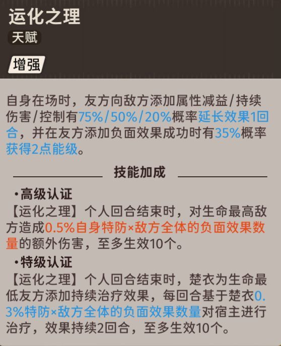天赋:添加负面效果有概率延迟效果时间且有概率获得回能,高级认证后造成额外伤害,特技认证后最低血量值单位回复血量