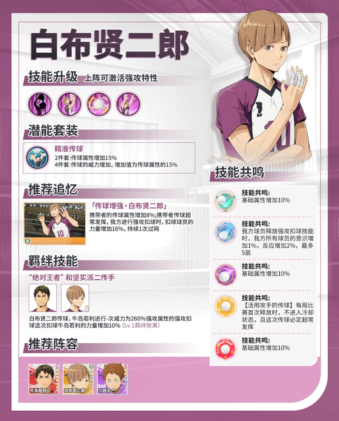 🔸不知道如何养成,阵容搭配?一张图带你全面了解「白布贤二郎(S)」的强力羁绊、推荐阵容、技能共鸣等等。